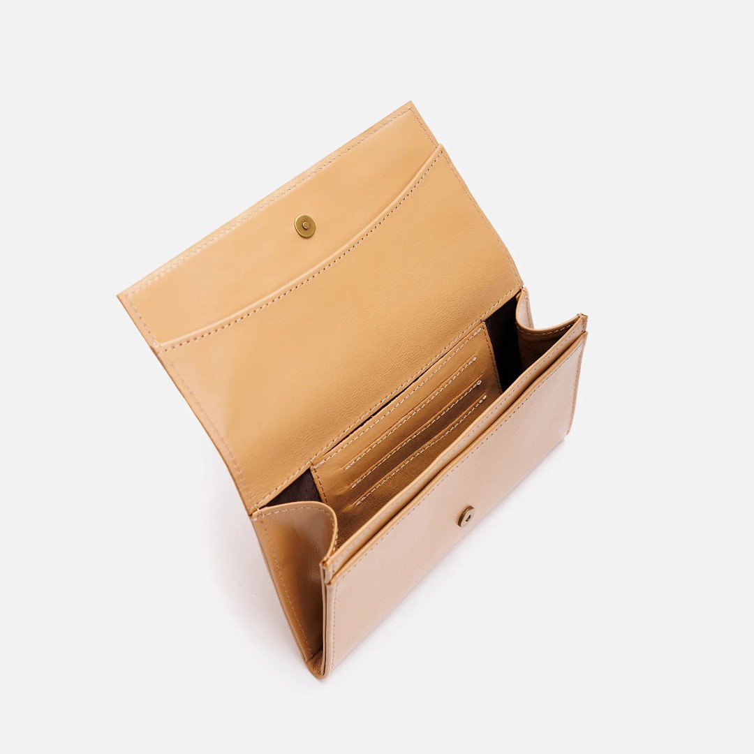 Кожаный кошелёк среднего размера на подкладке, закрывается на магнит. На передней стенке накладной карман, на задней стенке накладной карман и прорезной карман на молнии. Внутри одно отделение для бумажных купюр и второе отделение для документов в клапане, накладной карман с прорезями для трёх карточек.